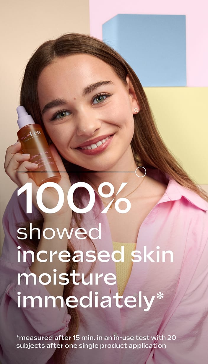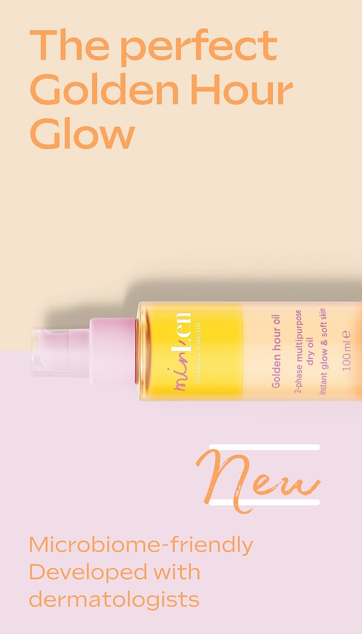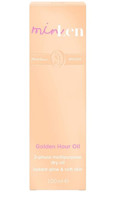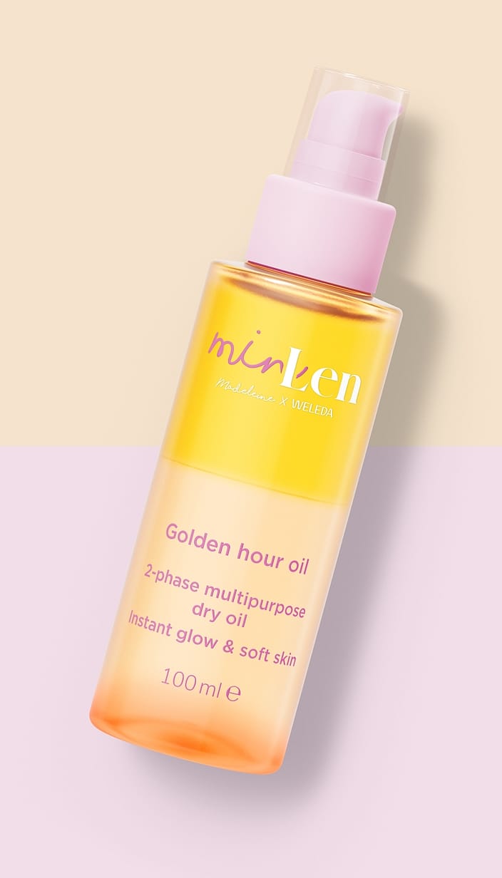 minLen Golden Hour Oil av Madeleine x Weleda – en lätt 2-fasolja för både ansikte och kropp. Med 100 % ingredienser av naturligt ursprung tillför den huden 24 timmars fukt, stärker hudbarriären och ger en mjuk, gyllene lyster på ett varsamt sätt.